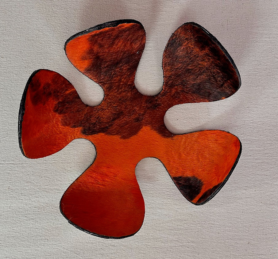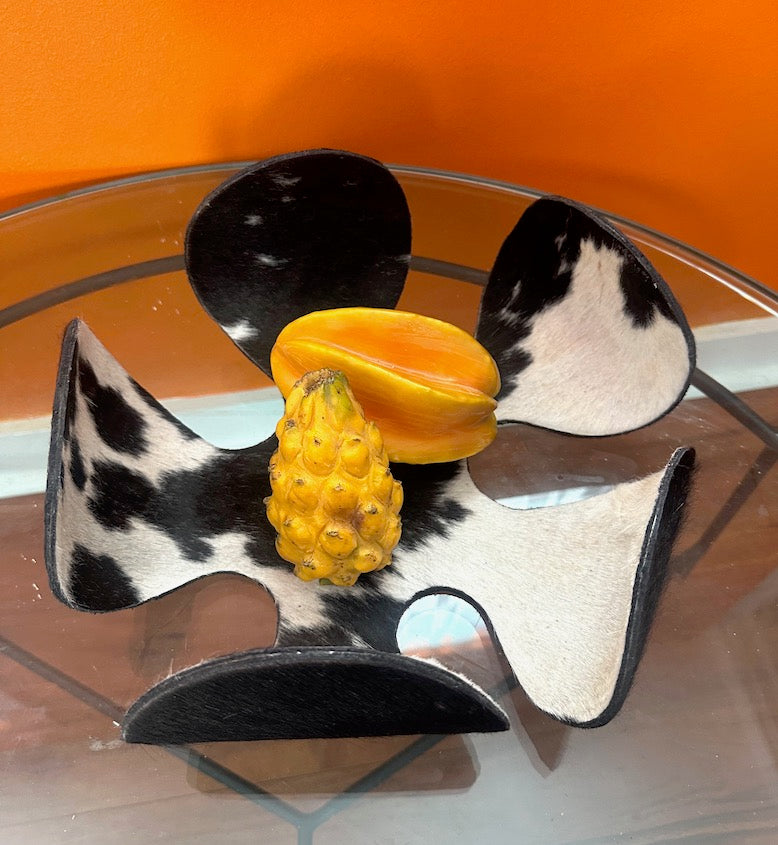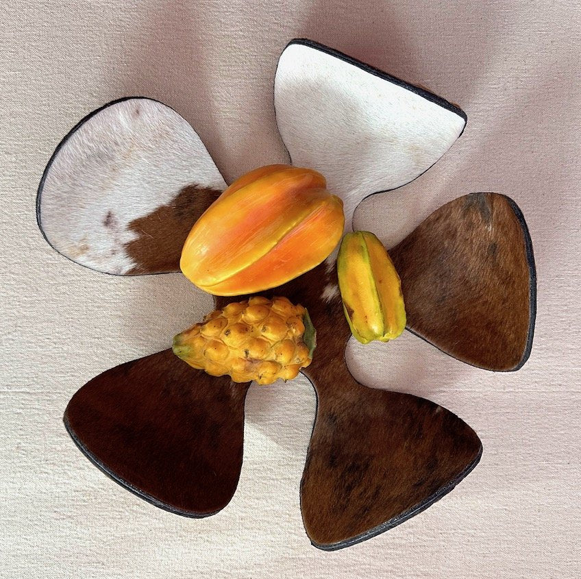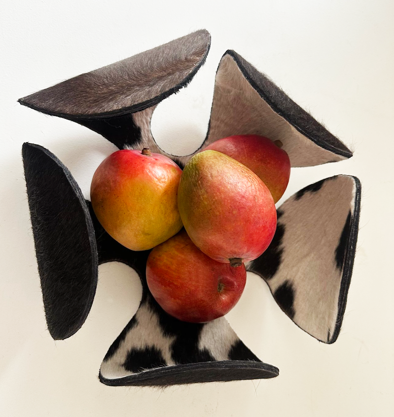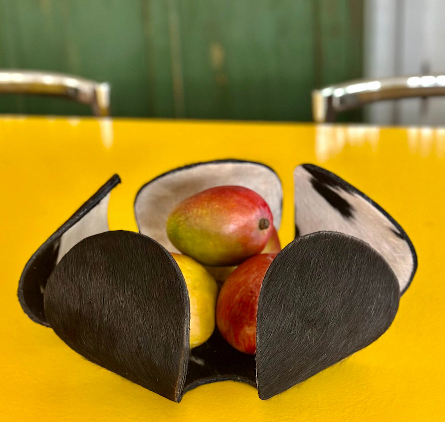 The FLORJULIA :: BOWL combines artisanal craftsmanship with sustainable materials. This flexible metal bowl features a striking design crafted from recycled metal, complemented by genuine hide accents in natural or richly dyed finishes. The integration of wood elements adds warmth and organic texture, creating a piece that bridges contemporary design with traditional techniques. Ideal for those seeking functional art that reflects environmental consciousness without compromising on aesthetic sophistication.