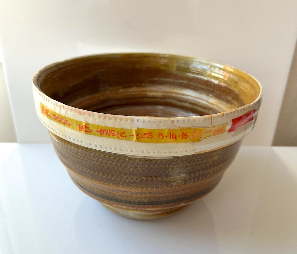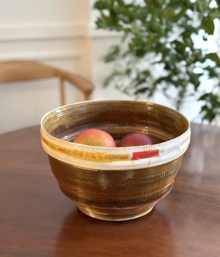 Crafted from vintage celluloid film, this ingenious bowl transforms cinema history into functional art. Each hand-crafted creation is entirely unique, capturing the essence of cinema's golden age. Choose between two sizes to suit your needs—display it as a striking decorative accent or use it as a fruit bowl. The material's delicate nature demands moisture-free handling to maintain its structural integrity. Made to order.